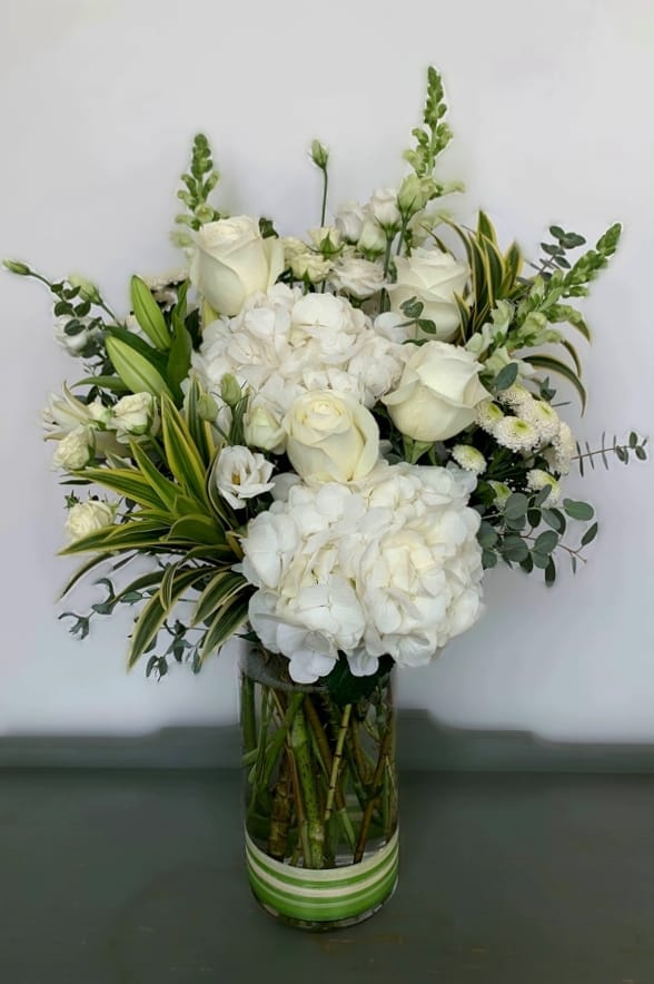 This all-white crafted arrangement features a luxury blend of premium florals, including lush hydrangeas, delicate roses, enchanting lisianthus and snapdragons with some tropical foliage in a tall glass cylinder.